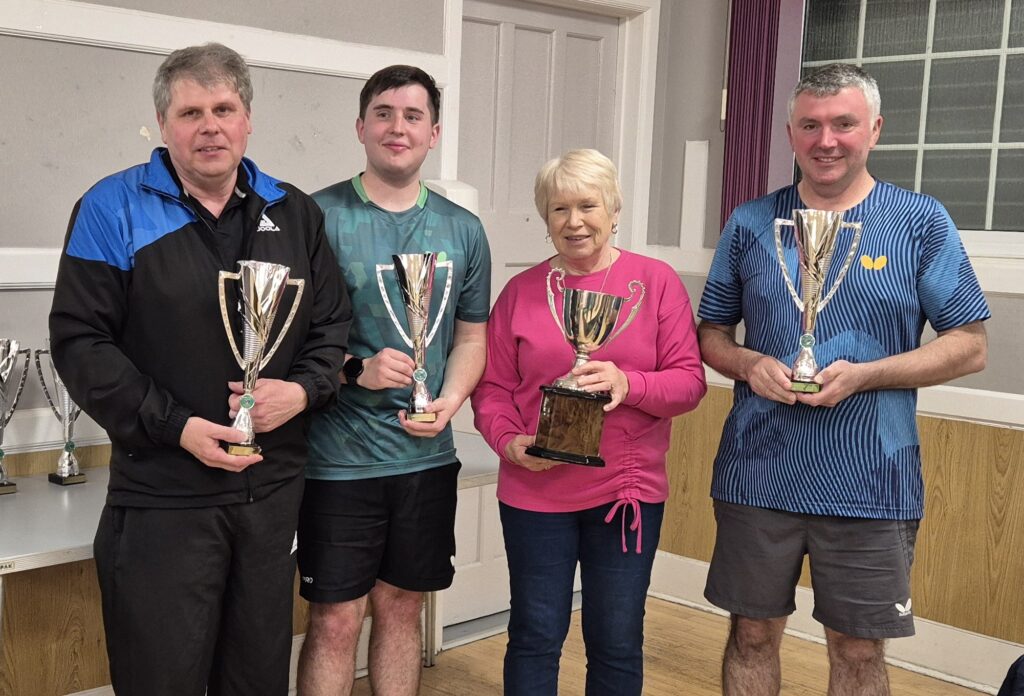 The two of them teamed up to take the men’s doubles, Hicks’ first win in the event, Davison’s eleventh. Dowsett was at the other end of the table again, partnered by Ashley Skeggs, and again there was a surprise comeback. The Liberal pair trailed by two games and 6-0 but rallied to win 11-9. It was the end of their challenge, though, Davison and Hicks easing to an 11-3 victory in the fourth game. Skeggs was also in action in the division one singles but put in a strangely subdued performance against Alesha Ellis-Austin, apparently believing that defence was the best form of attack, hoping that he could induce his younger opponent into mistakes. There were a few but not enough and Ellis-Austin became only the third female player – after Sarah Davison and Lucy Wang – to win the event. She dropped a game but won comfortably in the end 11-9, 6-11, 11-4, 11-4. One of the most impressive performances of the evening came from 18-year-old JJ Calisin in the junior boys’ singles. He gave reigning champion Ethan Collins little chance to settle against his all-out attack on both wings. Collins’ probing defensive style could not contain his opponent who won in three straight games. There was more probing and more defence in the restricted singles and this time it was enough as Dave Fiddeman took the title against the more adventurous Peter Davenport. Like Collins, Davenport has unorthodox rubbers on his bat, which caused Fiddeman some problems but he had sufficient control to wear him down in three straight games. Results: Men’s singles final: Scott Dowsett beat Paul Davison 9-11, 15-13, 11-5, 2-11, 11-8. Semi-finals: Dowsett beat James Hicks 11-4, 11-13, 11-7, 10-12, 11-4; Davison beat Luke Burridge 15-13, 11-9, 13-11.
