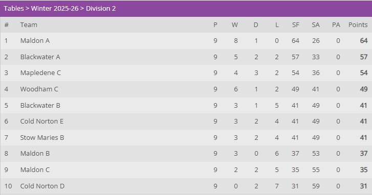 Blackwater A missed an opportunity to go top this week as the two top teams met in the Bragging Rights Battle of Division 2. The Blackwater trio welcomed the unbeaten league leaders Maldon A across the metropolis and into their West Maldon lair – Galatasaray it may not be but the heckles were up for sure. Maldon took an early lead with tight straight set wins for Colin Napper and Lloyd Bennett-Smith but once the nerves had settled the rudderless Blackwater side fought back with wins for Denis Balic and Neil Freeman. Maldon took the next 2 matches to lead 4-2 going into the lucky-dip doubles. The doubles journey matched some of the rollercoasters seen along Maldon Promenade over the years with no team being able to capitalise on any slender lead and so a fifth and deciding set was required. The experienced pairing of Napper and Bennett-Smith came through 11-6 to ensure at least a share of the spoils was secured. Just as well as Freeman took the next match against Dawn Baldry to tighten the gap, before the trusted Maldon stalwart Napper declared his side the winners with a 4 set battling triumph over the stoic Denis Balic. So with the match won perhaps Captain Bennett-Smith relaxed a little too much against the young whipper-snapper Noah Sage as he found himself in an almighty 5 set battle with 3 of the legs going way beyond deuce. So after a long and tense evening these two were still at it 12-12 in the deciding set – did they not want to get home before midnight? In the end the youth of Sage was too much for the energy starved Maldon supremo and the final point went to Blackwater for a 4-6 defeat but pride intact. Maldon C recorded the same winning margin over Stow Maries B with hat-tricks for the inform Marty Englander and the effervescent Dawn Baldry. Stow’s Dave Marsh had a fun evening playing 19 out of a maximum 20 ends – with 1 win in the singles and a cracking doubles win with Peter Hance 12-10 in the fifth! Neil Want was the star turn in the match between Woodham C and Cold Norton D with a troubled hat-trick. A straight sets win over Allan Steel but with each leg going beyond deuce and then an almighty topsy turvy battle with tricky lefty Pete Harverson that was only secured 11-9 in the fifth. Despite Want’s brilliance his team lost again leaving Cold Norton D as the only team in the league without a win this season. 6-4 to Woodham in the end with Steel and Harverson taking two points apiece. Cold Norton E had that Squelchy feeling this week after encountering the growing prowess of Blackater B’s rarely spotted, but very effective, secret weapon that is Simon Quelch. This week Quelch was in indefatigable form as he dispatched all of his singles opponents for a well earned star player badge. The most difficult match being a tasty 5-setter with Dick Wyman where The Quelchmeister recovered from 0-2 down to wear down his opponent to win out 11-9 in the decider. Wyman and Tony Forster were in fine fettle on the night recording 2 wins each as part of the overall drawn encounter.