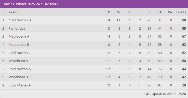 Division 1 leaders Cold Norton B started the period well with a decent win over Cold Norton A – the final score of 7-3 may have been predictable given the line-ups but there were a couple of upsets as Sam Lowman completed his hat-trick for the B team with a topsy-turvy 5 set victory over Duncan Taylor, and the A Team’s Steve Maltby came out on top in another 5 setter against Dave Richardson. This result seemed much better for Cold Norton B when later in the week when closest contenders Fambridge were held by Mapledene A with the league’s top player Liam Squirrell recording a nine dart hat-trick against the Fambridge trio. Squirrell partnered up with Dan Patynski for the doubles, but the real shock was Steve Muth taking out John Poysden over 5 hard fought sets to set up the draw. For Fambridge Mark Stones and Keith Adams both recorded wins over Muth and Patynski. Mapledene A were by far the busiest team over the period with a further 2 matches. The first was the key battle with leaders Cold Norton B with some of the potential Singles Championship finalists up close and personal. George Reeves came from behind to defeat Eric Green in the opening match to set Mapledene on their way. Mapledene’s Liam Squirrell continued his dominance as he revenged his only defeat of the year with a 4 set triumph over Sam Lowman that secured his hat-trick. Kieran Skeggs was on great form with 2 straight set wins over Eric Green and Lowman, with his only loss falling to Ian Wall. This brings the gap to below 10 points with Fambridge having a game in hand – with the two protagonists meeting in early March in what is becoming a winner takes all affair. Elsewhere in the Division Mapledene B defeated Cold Norton C as Kieran Skeggs and Colin Chatfield combined for all the points in the 6-4 victory, with Chatfield dropping just the one singles to Arron Chandler. Mapledene A came out on top in the Mapledene Showdown as they bettered their own B team 6-4. Yet again it was the indefatigable Liam Squirrell that made the difference as he recorded another treble of straight sets victories. This time Squirrell was excused from doubles duty but his team-mates did him proud as Steve Muth and Dan Patynski edged a 5-setter against Glenn Johnson and Simon Jacob despite having lost all 4 singles to the B team pairing. The final match saw the bottom two sides face up in the wooden spoon cup with Woodham B squeezing out a much needed 6-4 victory. Star of the night was the vastly improved Peter Harverson who hit his first top flight hat-trick including an intense 5 set battle with Richard Storey. Harverson was well supported as Eamonn Hall won 2 and Graham Briggs chipped in with a win over Ken Sheard.
