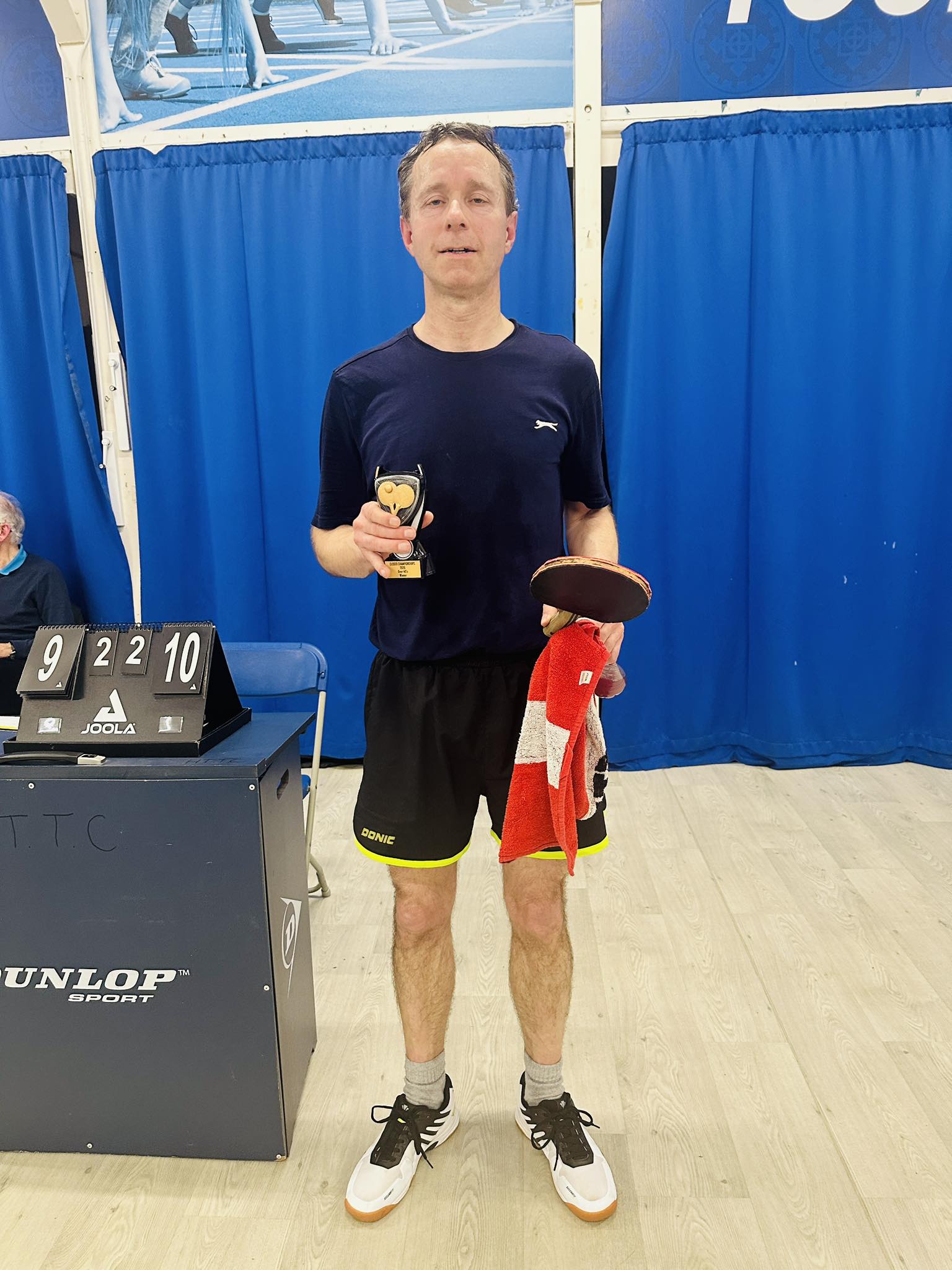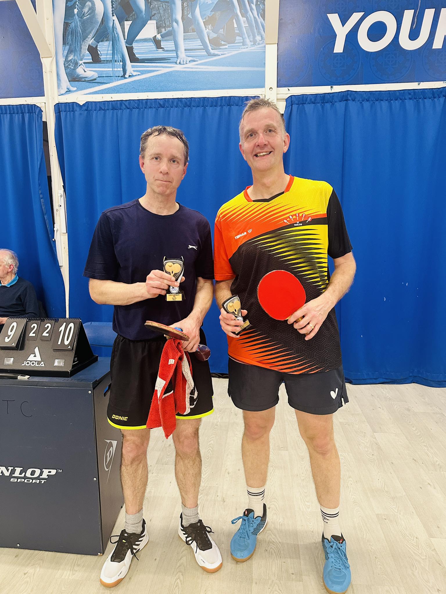 The Vets Over 40’s final pitched seasoned doubles partners Taylor and Read against each other and the script was probably pre-written here as they produced a long and intriguing five set encounter eventually won 15/13 10/12 12/10 8/11 11/9 by Read. There were some intense rallies throughout as Read sought to impose his attacking game on Taylor’s staunch defending and the final set saw even more drama as Taylor had a spectacular fall with the score at 6/7. Whilst he soon recovered, without apparent injury, it would have been the last thing he wanted at such a crucial time.