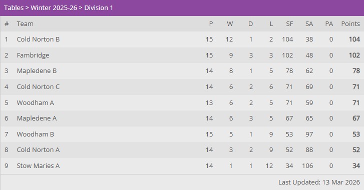 The battle for supremacy in Division 2 took a well earned break this week leaving us time to focus on the amazing battle at the other end of the table where 5 teams are now separated by just 2 points and race to be relegated is as tight as an otter’s pocket.   Cold Norton D remain on the precipice with just 2 games to go but curried up an unexpected win this week against a strong Mapledene C side.  A 6-4 victory wasn’t quite enough to jump off the bottom but they are now in a 3 way tie for the automatic relegation slot.  Neil Want hit two wins including a tight 12-10 in the fifth delight over Lin Roff, no doubt the winning shot was a dodgy net.  Rob Harris also chipped in with 2 wins, and then combined with Want for the doubles bonus.  Tony Forster added the final point with another 5 setter as he came from behind to get past the tricky Mike Johnston.  For Mapledene both Denis Squirrell and Roff took two wins for their haul across the evenings play.  Maldon C lost out to Blackwater B by a 7-3 margin and that puts them level at the bottom with both Maldon B and Cold Norton D.  The Maldon trio team took a real Quelching at the hands of Blackwater B as they succumbed to the cultured play of talisman Simon Quelch.  Quelch took his hat-trick although struggled to get past the defensive nous of Brian Riedling and only eventually won out at 14-12 in the decider.  Merv Perriman was in fine fettle with two 3 leg victories and then just lost out to Marty Englander 11-9 in the fifth.   Woodham C in full uniform took a well earned 6-4 triumph over the tricky Cold Norton E trio.  In a friendly atmosphere where little was at stake every player took at least a point.  For Woodham Alan Dadswell and Skippy Perry hit braces, as did Dick Wyman for the Nortonians.  Special mention to Oscar Wyman who won another point for his team as he defeated last year’s Roy Davis Cup winner Allan Steel in straight sets.  Next week sees the much anticipated top of the table clash to see if Maldon A will falter under the burgeoning challenge of Blackwater A.